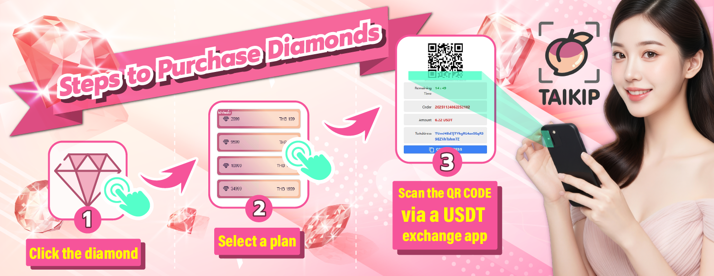 TAIKIP presents the ultimate HOT DEAL 199 Baht! Top up diamonds effortlessly at an affordable price, support your favorite creators, unlock exclusive clips or special content instantly! Payment via USDT is safe, convenient, and comes with low fees. TAIKIP